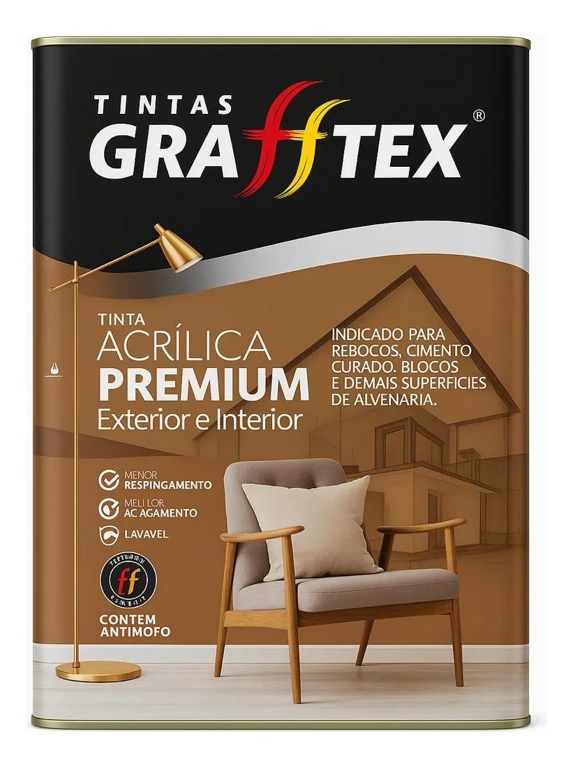 GRAFFTEX ACRÍLICO PREMIUM é uma tinta acrílica de qualidade superior de fácil aplicação, baixo respingamento, excelente nivelamento, ótima cobertura, rendimento e resistência ao intemperismo. Indicada para pinturas externas e internas de reboco, concreto, massa fina, blocos de cimento, fibrocimento, gesso, massas, texturas e repinturas em geral.Produto classificado conforme Norma ABNT NBR 11702 – Tipo 4.5.1 o acabamento fosco está em conformidade à norma ABNT NBR 15079.